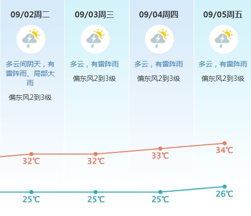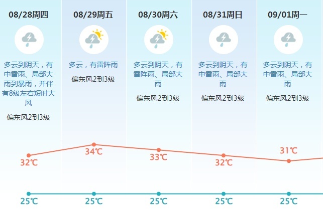 预计我市受南海热带系统影响,28日有中雷雨、局部大雨到暴雨,雷雨时伴有8级左右短时大风等强对流天气;29—30日有雷阵雨、局部大雨;31日—9月1日有中雷雨、局部大雨,并伴有8级左右短时大风;展望9月2—5日仍有雷阵雨天气。请注意防御局地短时强降水、雷雨大风等强对流天气及其引发的次生灾害。